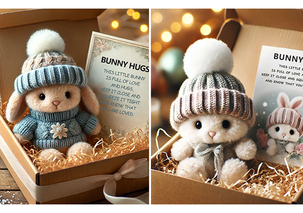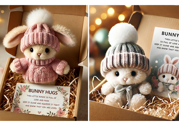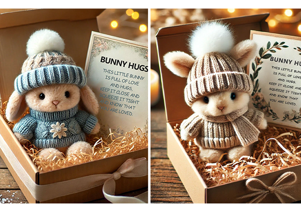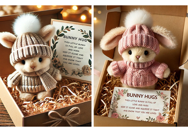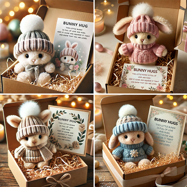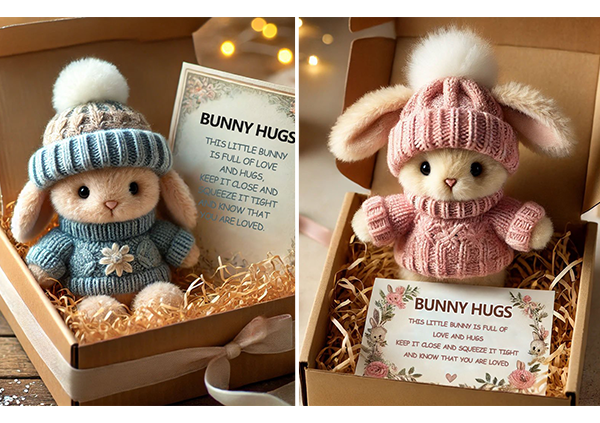 đ I en charmig presentförpackning, omgiven av mjukt strimlat papper, Ă€r den hĂ€r kaninen redo att lysa upp nĂ„gons dag. Oavsett om du skickar en kram frĂ„n lĂ„ngt hĂ„ll eller ger en stund av vĂ€rme, bĂ€r den hĂ€r lilla följeslagaren ett hjĂ€rtligt budskap av kĂ€rlek och trygghet.