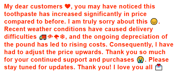 My dear customers ❤, you may have noticed this toothpaste has increased significantly in price compared to before. I am truly sorry about this 😔. Recent weather conditions have caused delivery difficulties 🚚⛈🌪❄, and the ongoing depreciation of the pound has led to rising costs. Consequently, I have had to adjust the price upwards. Thank you so much for your continued support and purchases 😭. Please stay tuned for updates. Thank you! I love you all 💌