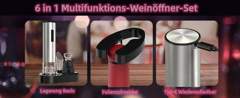 🥰💝6-i-1 presentset: 6-i-1 set för vinälskare inkluderar automatisk korkskruv x1, folieskärare x1, luftare hällare x1, en vakuumpropp x1, displaybas x1. Basen kan endast användas för förvaring och kan inte användas Ladda flasköppnaren direkt.