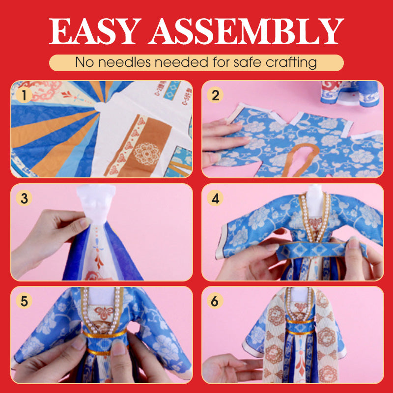 ENKEL MONTERING – Förvandla tyg till fantastiska kläder utan ansträngning, utan behov av nålar eller tråd, vilket garanterar säkerheten. De medföljande steg-för-steg-instruktionerna guidar barnen i monteringen av traditionella kinesiska kläder och ger timmar av kreativ och engagerande lek under hela processen.