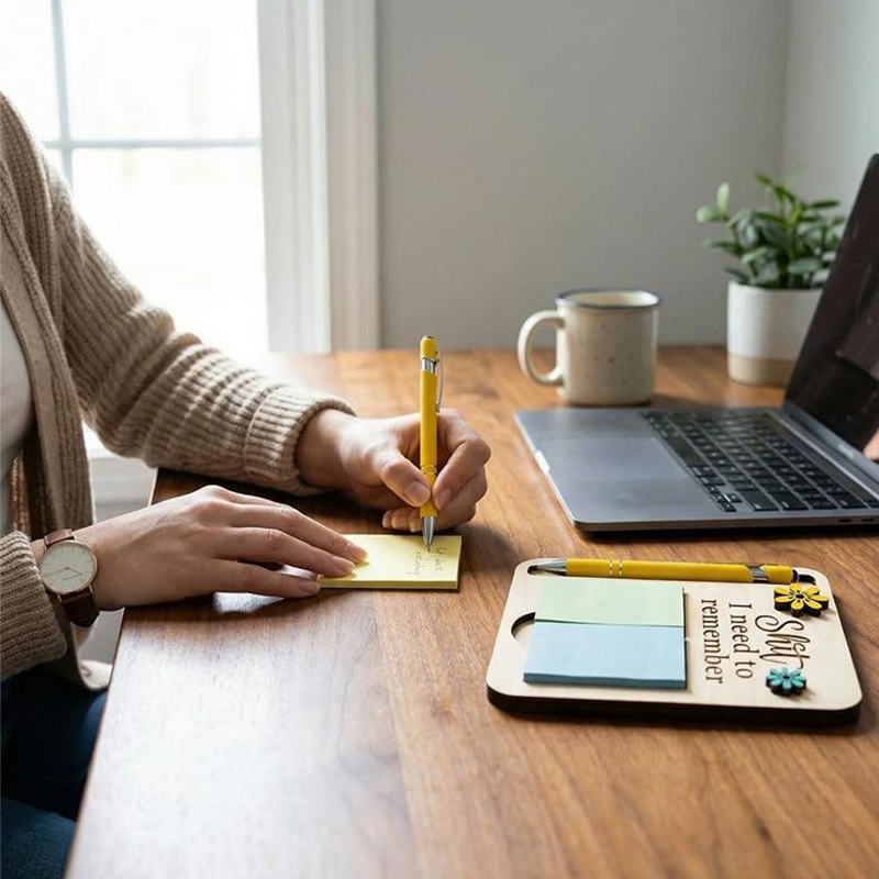 MATCHANDE FÄRGSET – Inkluderar en matchande färgad penna och ett block med post-it-lappar, vilket skapar ett enhetligt och visuellt tilltalande utseende. De livfulla färgerna gör att dina påminnelser sticker ut och tillför en gnutta charm.
