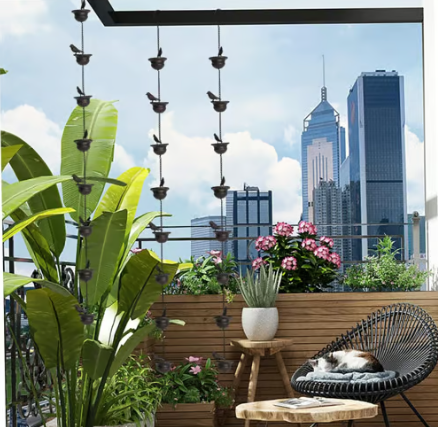 Denna kaskaderande regnkedja är ett fantastiskt alternativ till traditionella stuprör. Regnvattnet rinner graciöst från ett fågelbad till nästa, vilket skapar en naturlig vattenfalleffekt som både är vacker att se på och rogivande att lyssna till.
